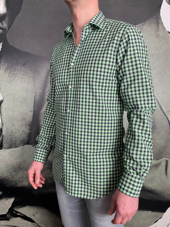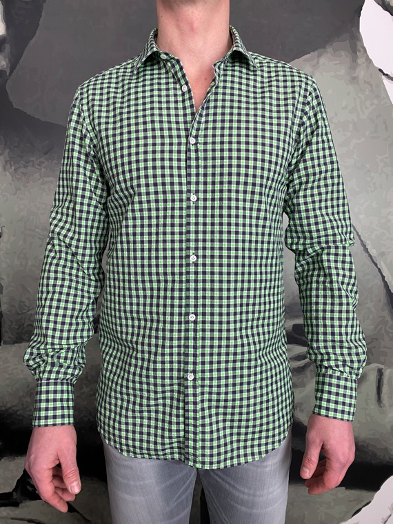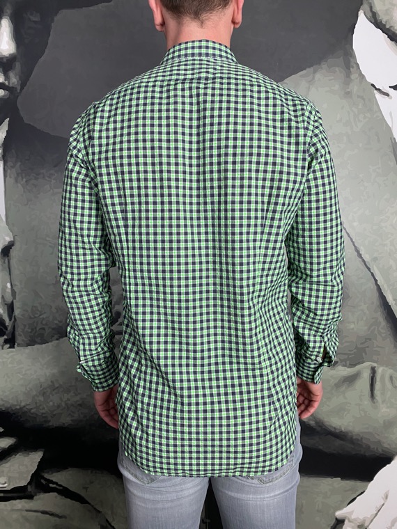 Chemise sport par excellence qui illuminera vos tenues. Facile avec des couleurs basiques (gris ou marine) mais aura de la prestance avec des couleurs plus estivales. Fabriquée en Italie 100% Coton Lavage 30° Chemise à manches longues, tissu seersucker formant des carreaux blancs et vert pomme sur un fond marine. Col ville qui peut être tenu par des baleines. Fermeture par sept boutons. Coupe cintrée. Le modèle mesure 1m83 et porte une taille 40.