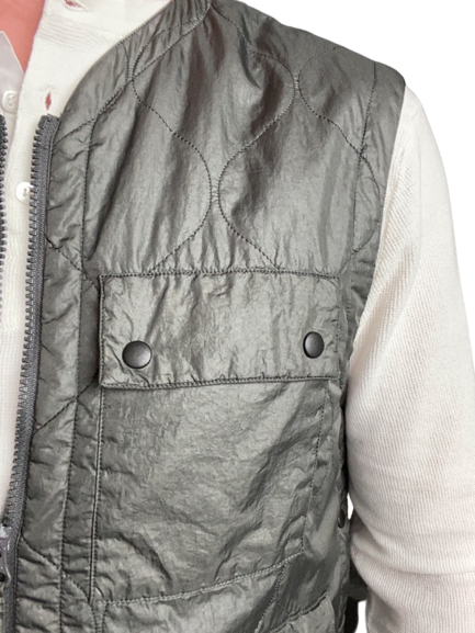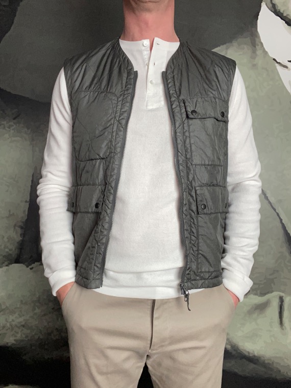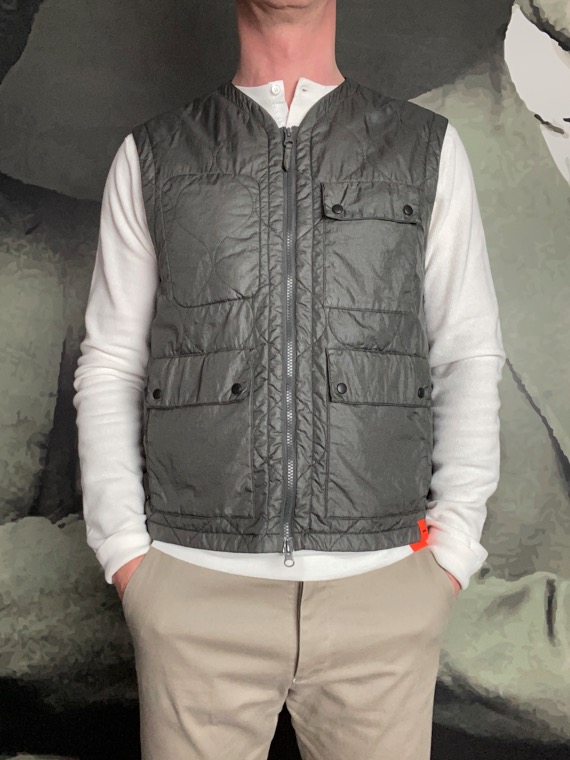 Indispensable à utiliser tous les jours soit pour un effet sport chic à porter sous une veste en complément, en guise de doublure ou bien en remplacement d’un blouson. Fabriqué en Italie 100% Nylon System Thermore. Lavage 30° Gilet sans manches en nylon vert avec system Thermore breveté isolent depuis 1972. Fermeture éclair double curseur. Trois poches plaquées à rabats pressions. Deux poches intérieurs zippées. Le modèle mesure 1,83 m et porte une taille L