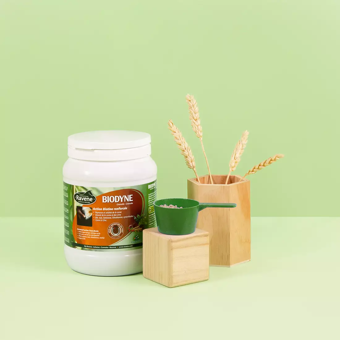 BIODYNE se présente sous forme de granulés appétents, à mélanger à la ration quotidienne de votre cheval à hauteur de 30g (1 dosette incluse) pendant 1 mois. À renouveler 3 fois dans l’année. Nous vous conseillons de coupler l’action de BIODYNE avec PEDIFLEX (onguent fluide), pour permettre aux sabots de votre cheval d’être protégés à la fois de l’intérieur et de l’extérieur.