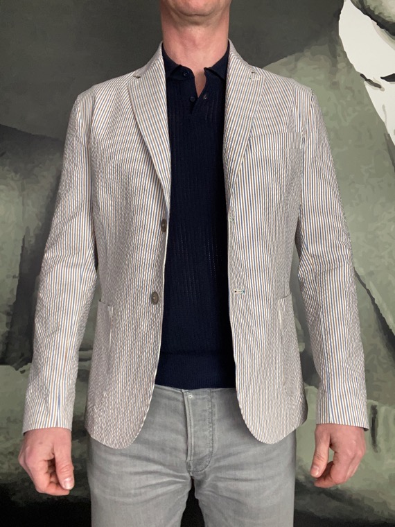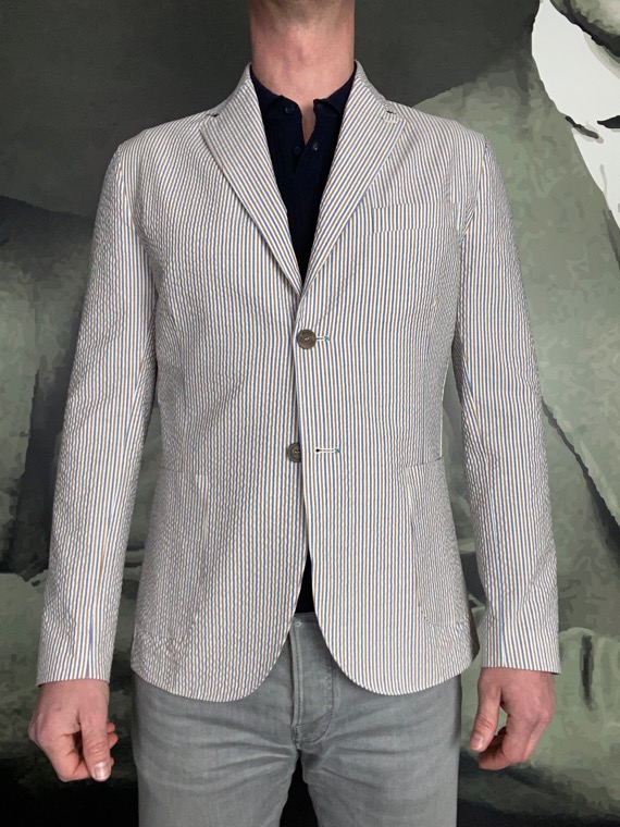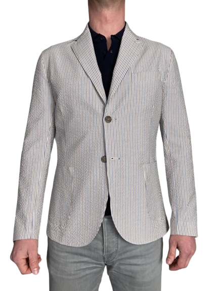 Veste casual chic par excellence. Utilisable facilement avec chemise, t-shirt, jeans et chino voir bermuda. Fabriquée en Italie 100% Coton Nettoyage à sec Veste déstructurée (sans épaulettes pour un effet plus naturel et décontracté) coupe droite deux boutons. Tissu en coton seersucker rayé trois couleurs, blanc, ciel, marron clair. Poches plaquées. Poche poitrine. Deux fentes dos.