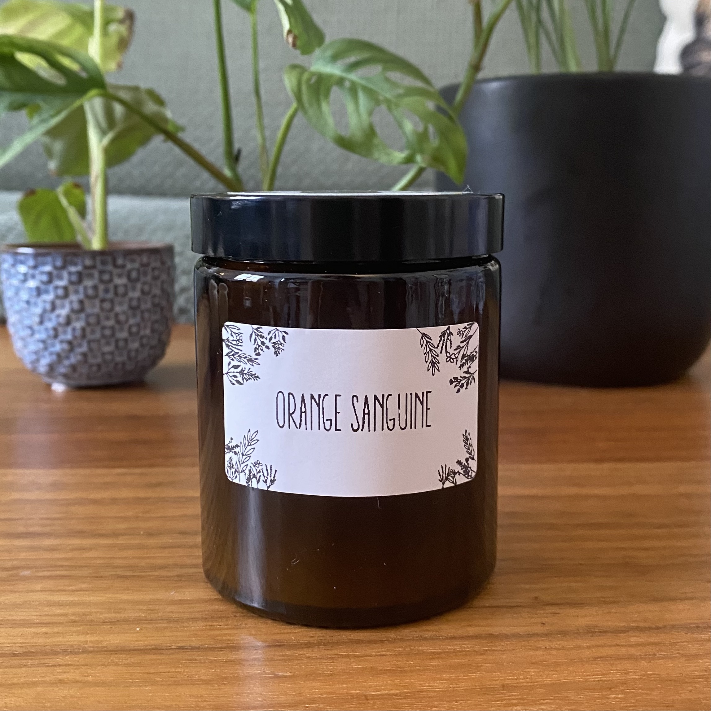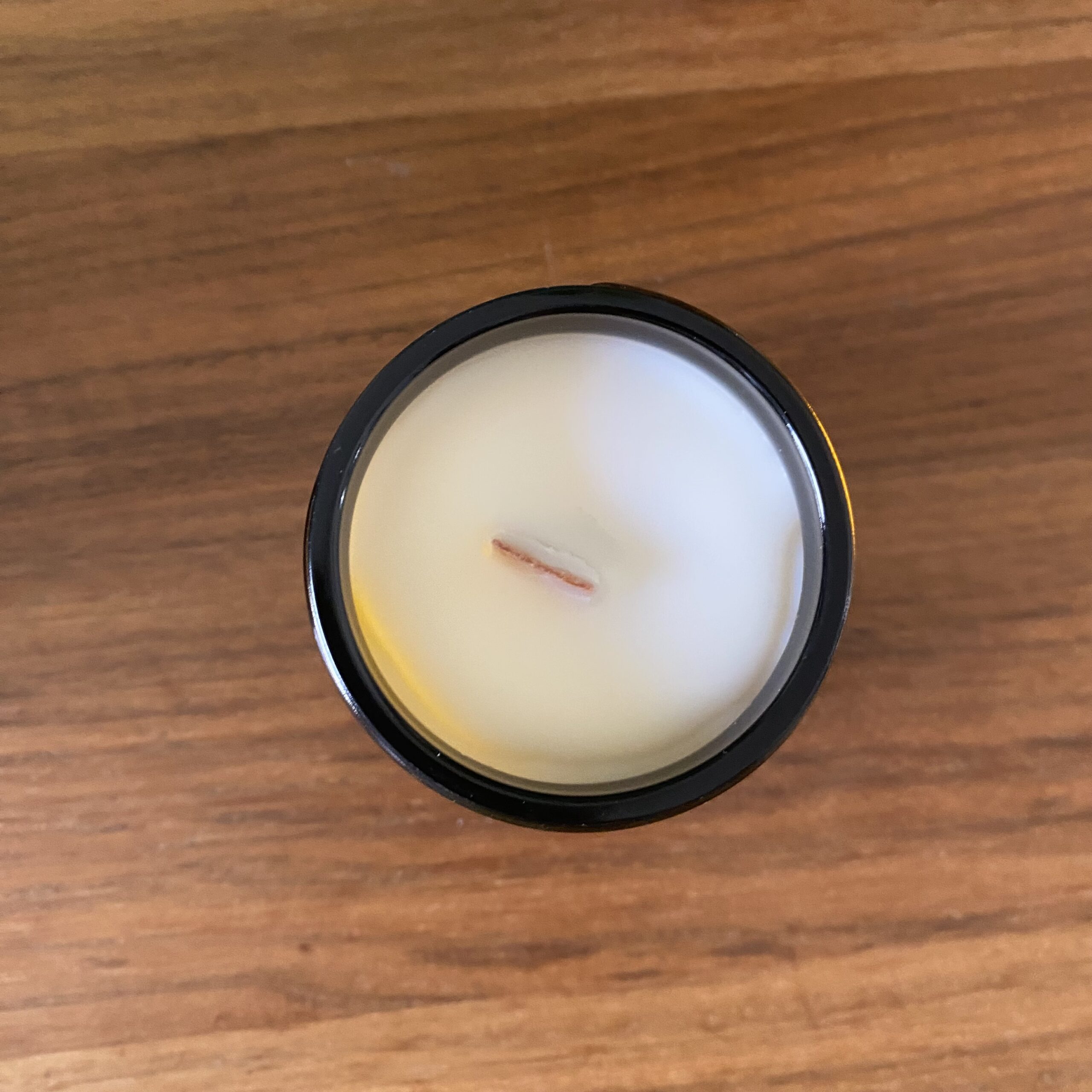 Bougie en cire d’huile d’olive/colza dans un pot en verre ambré avec mèche en bois.