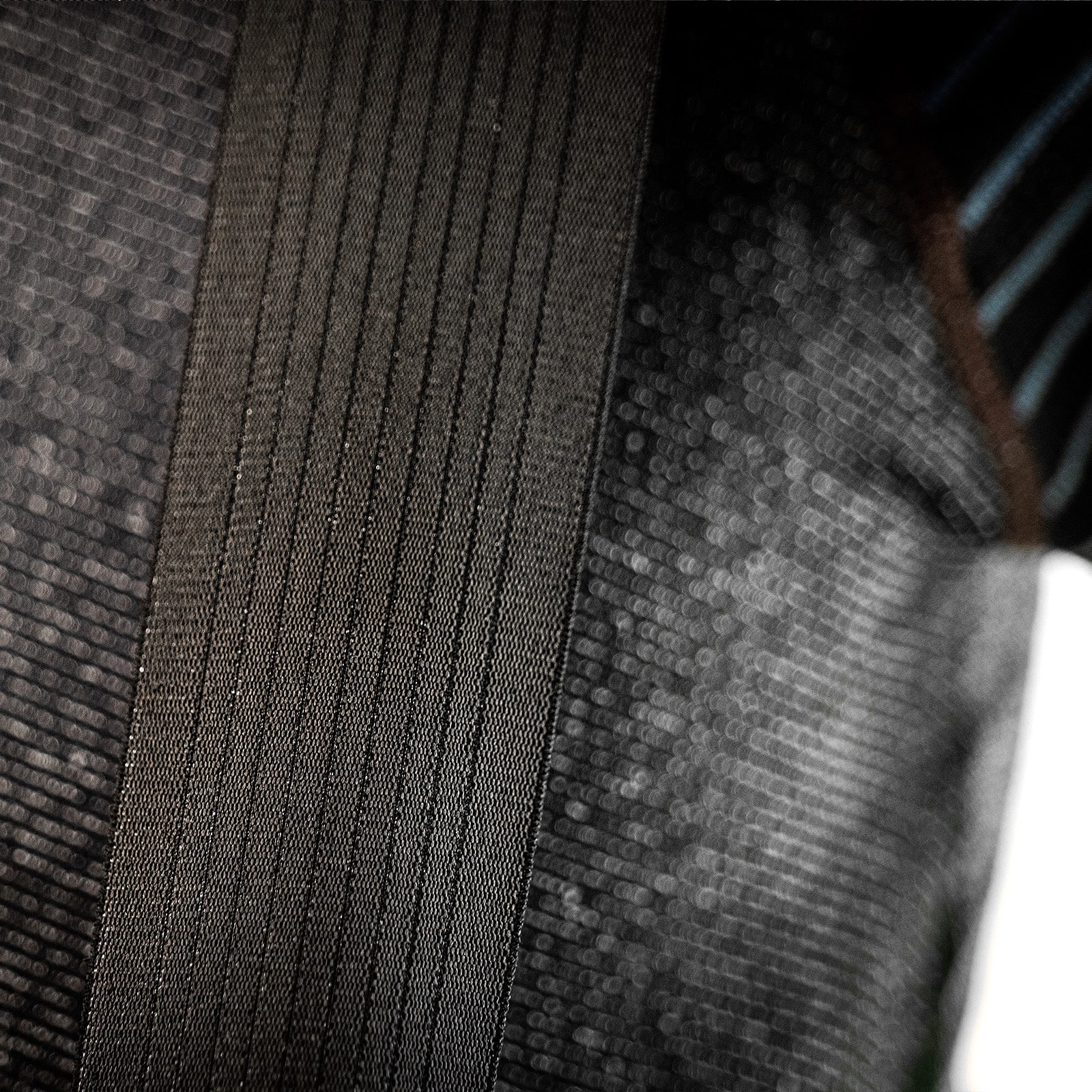 Les bretelles sont en tissu perforé, reliées sur le dos par un filet élastique, maintenant parfaitement le collant en place sur le dos et le buste. La conception prévoit une bande sans couture au niveau des genoux, pour faciliter au maximum les mouvements et éviter les frottements et irritations.