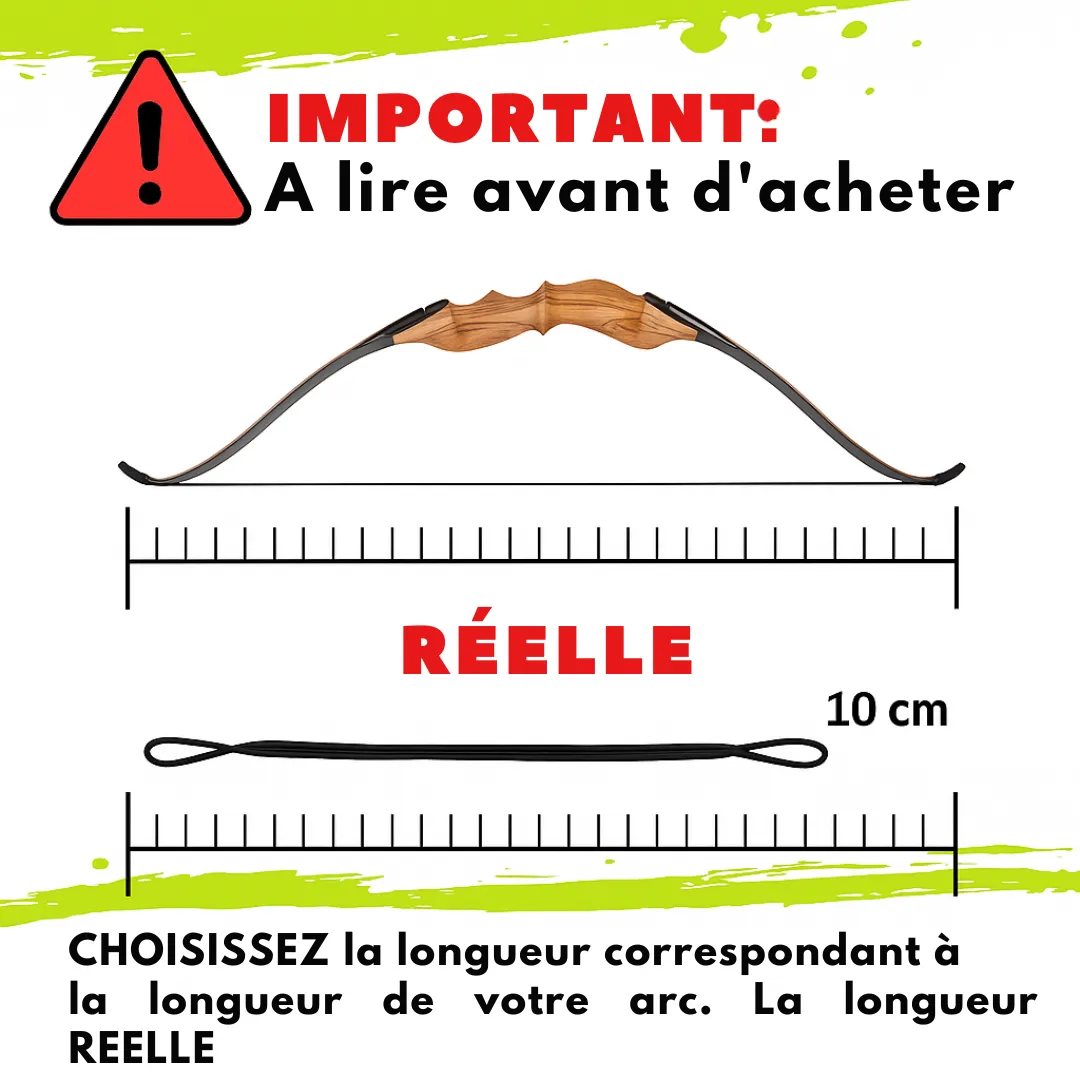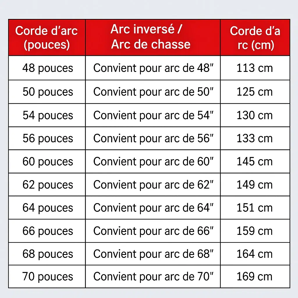 - Longueur : Différentes longueurs disponibles pour s’adapter aux arcs de diverses tailles.