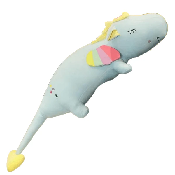 Grand coussin peluche en forme de licorne allongée.