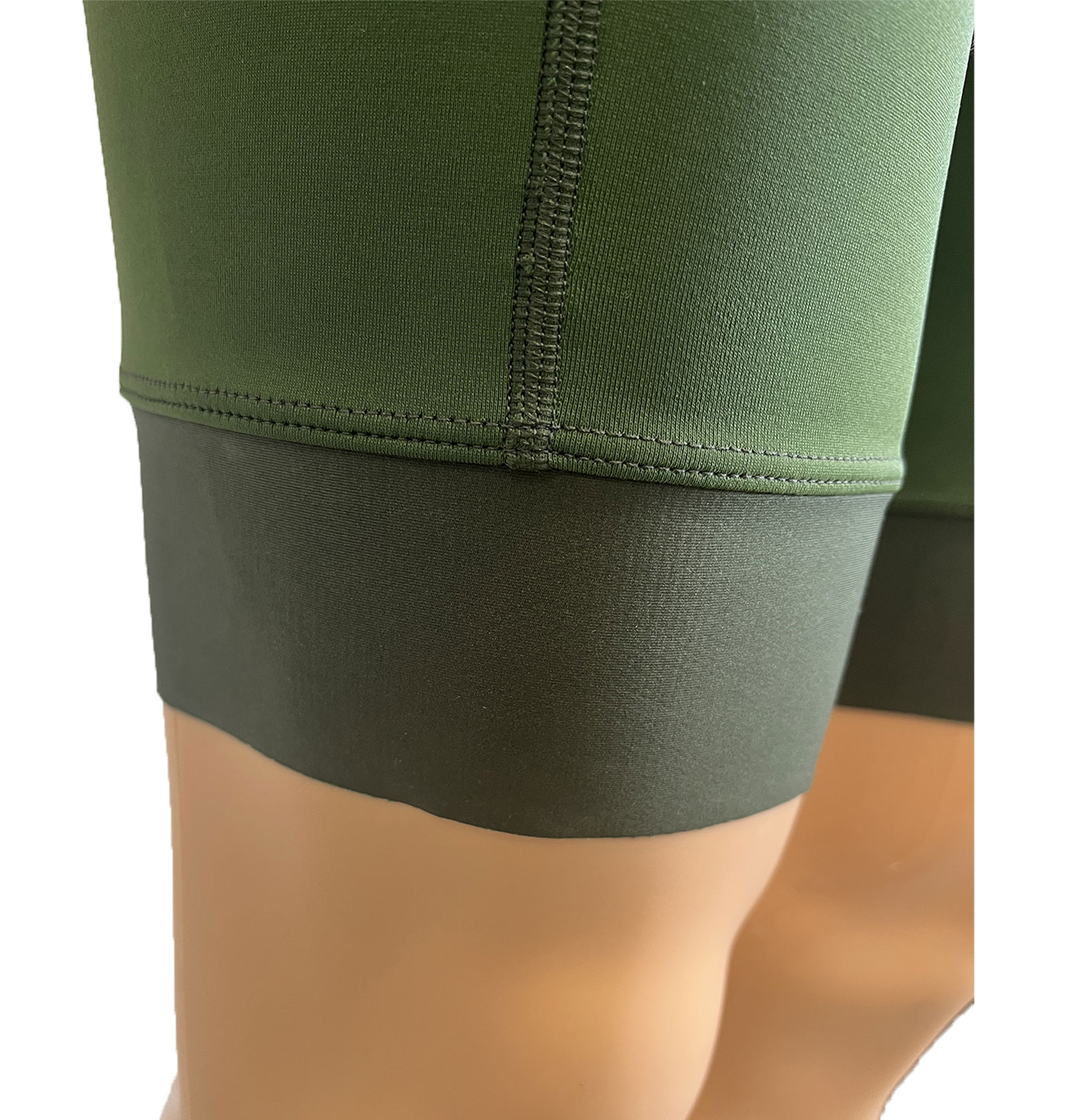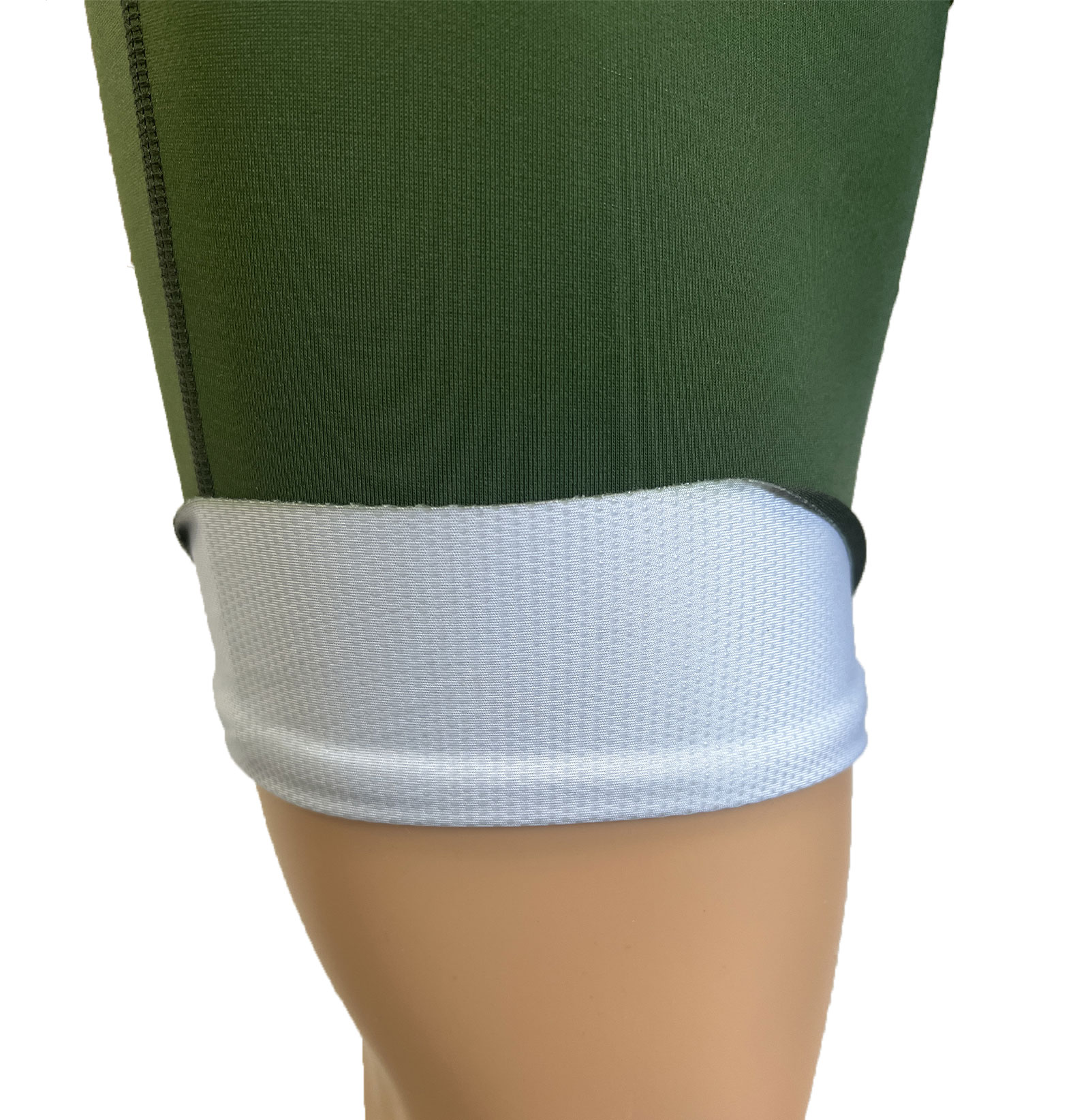 Sur le bas des jambes, une bande de tissu de 6cm de hauteur, coupée au laser, au dos de laquelle sont disposés des points de silicone, permet de tenir le cuissard en place sur vos cuisses.