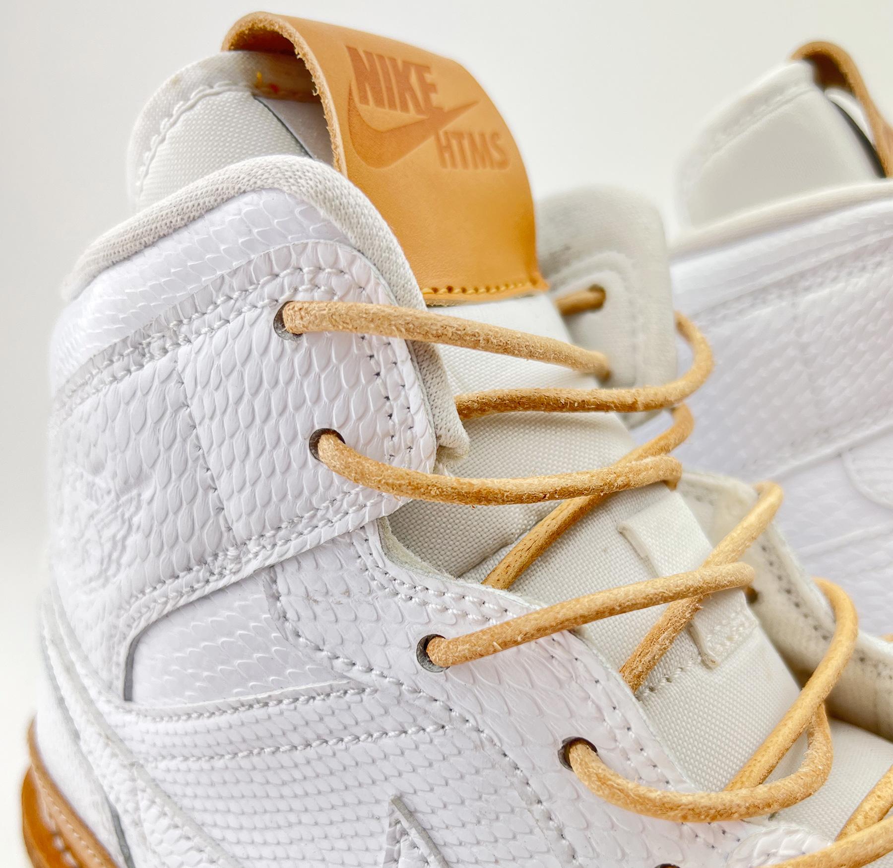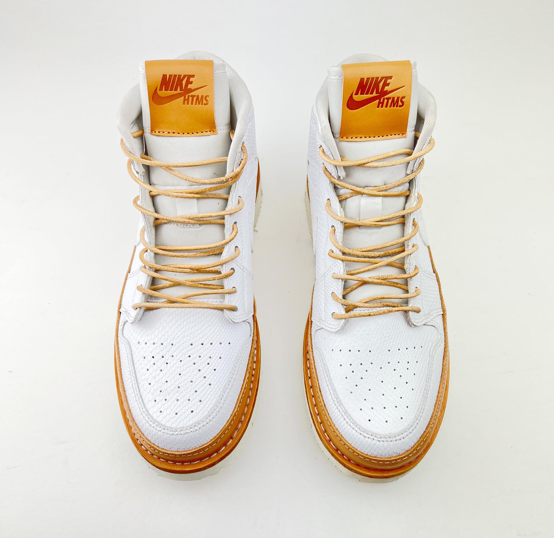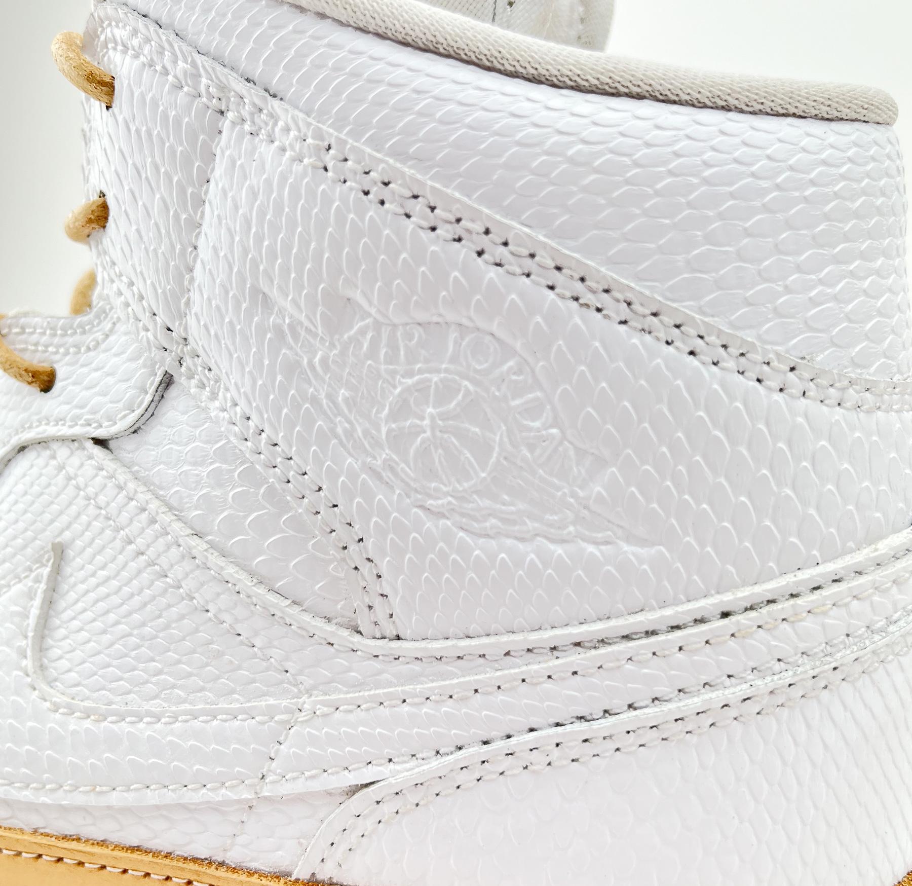 La AJ1 Mid Gloxy est issue de la volonté de recycler les tiges utilisées pour nos workshop AF1. Montage Kneipp avec bandeau cuir tannage végétal et semelle vibram. Elle est unique et extrêmement confortable. Lacets cuir, semelle intérieure cuir et latex. Tige en snake skin. Cette paire est numérotée. Disponible uniquement en pointure 42 EU.