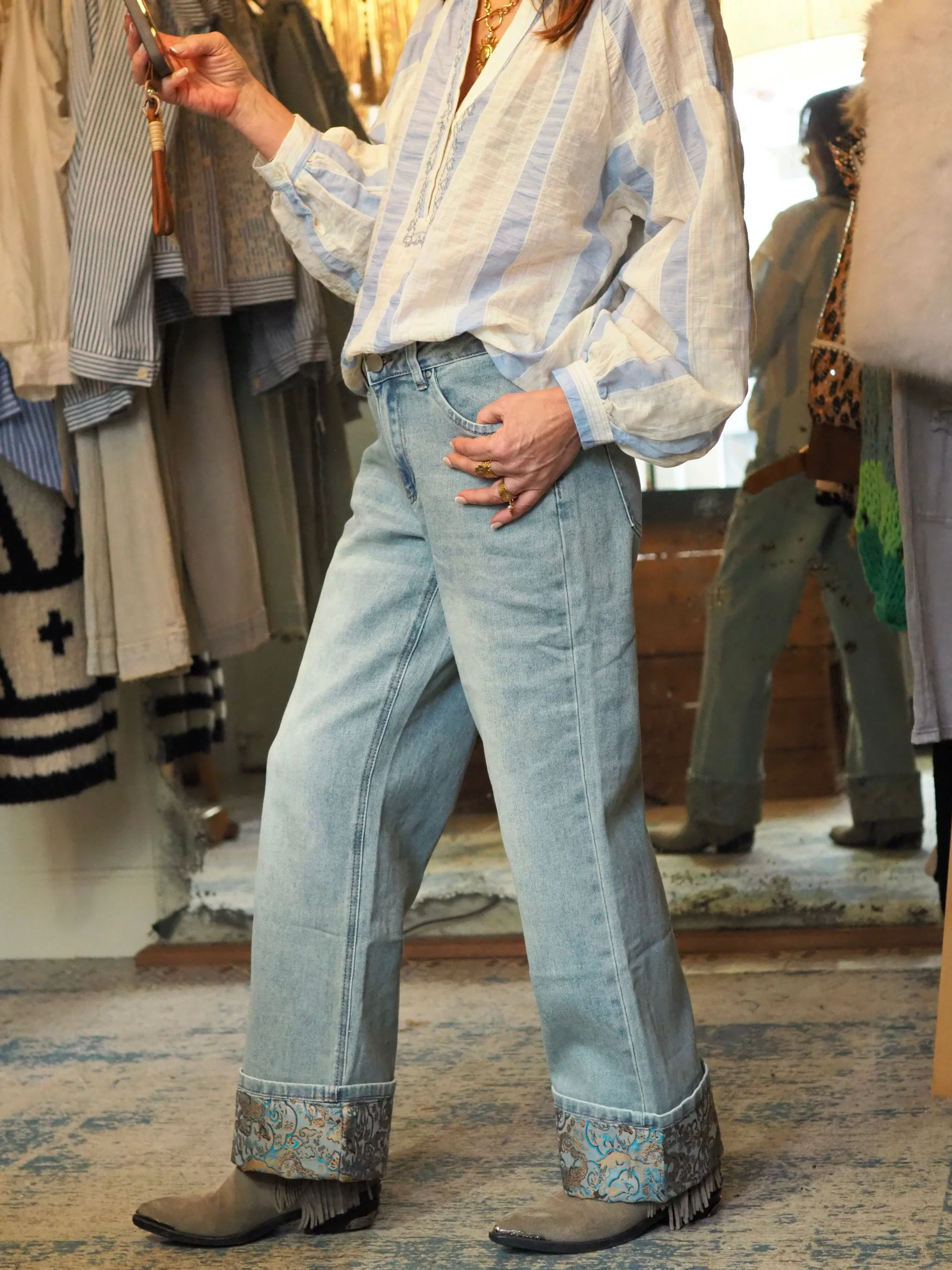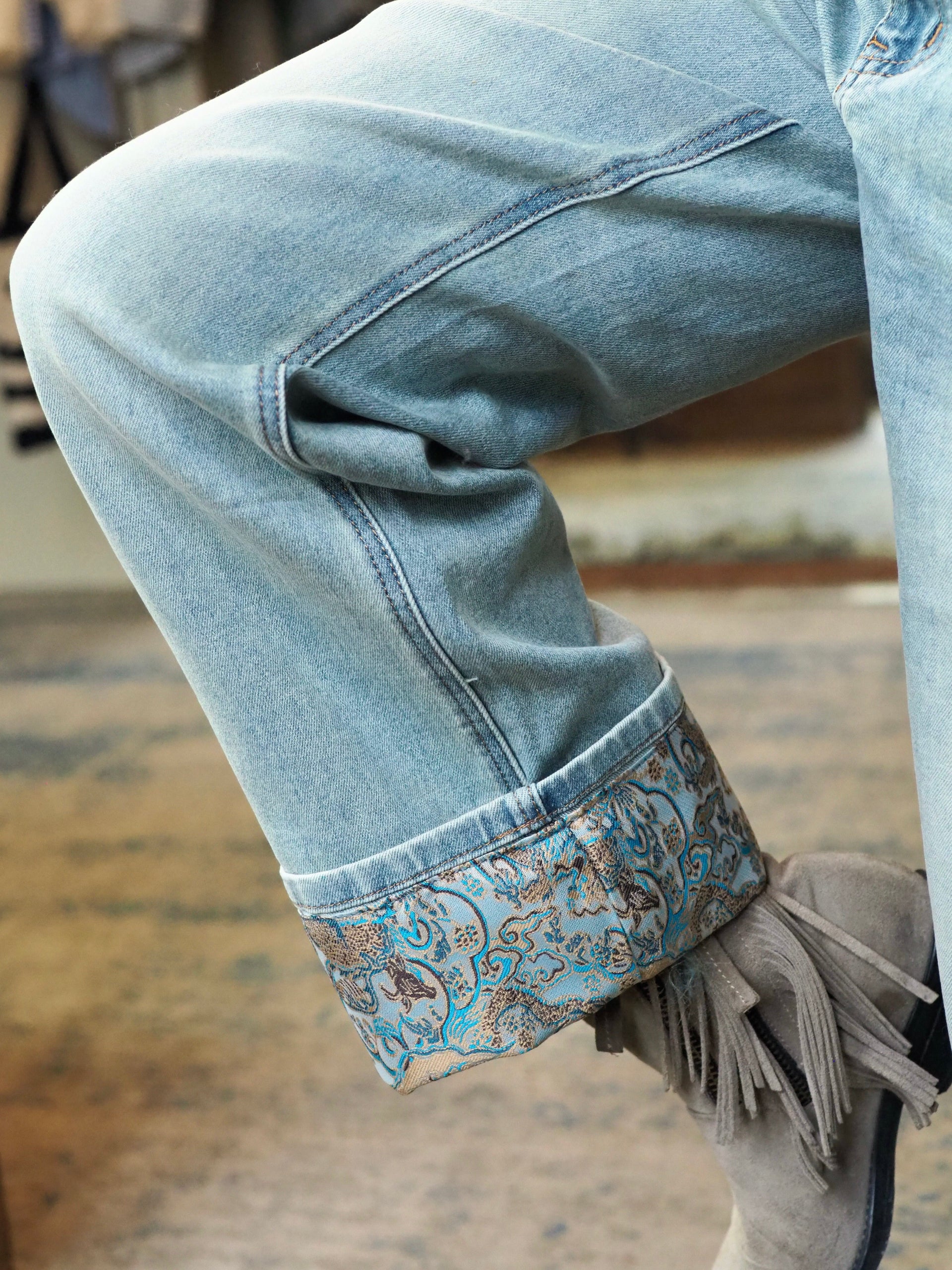 Jeans bleu clair avec grand bord style tapisserie bleu turquoise. Coupe droite. peux se porter bord deffait. Taille grand, j’ai pris une taille en dessous. Marque: TOXIC3