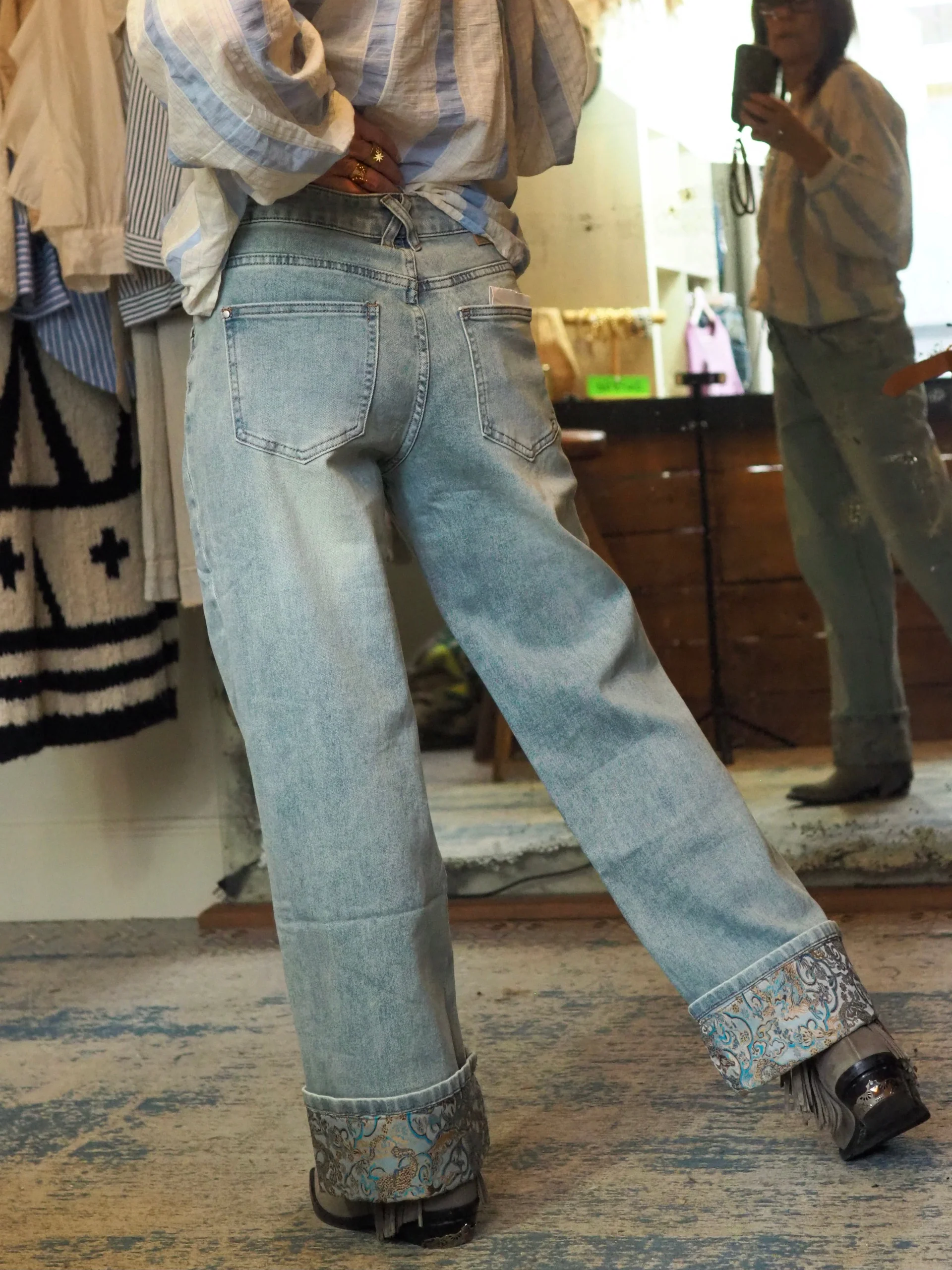 Jeans bleu clair avec grand bord style tapisserie bleu turquoise. Coupe droite. peux se porter bord deffait. Taille grand, j’ai pris une taille en dessous. Marque: TOXIC3 94% Coton 5% Polyester 1% Elastane. Taille XS/34 S/36 M/38 L/40 XL/42 mais taille grand. Cathy mesure 1m66 fait un 36 et porte une taille XS.