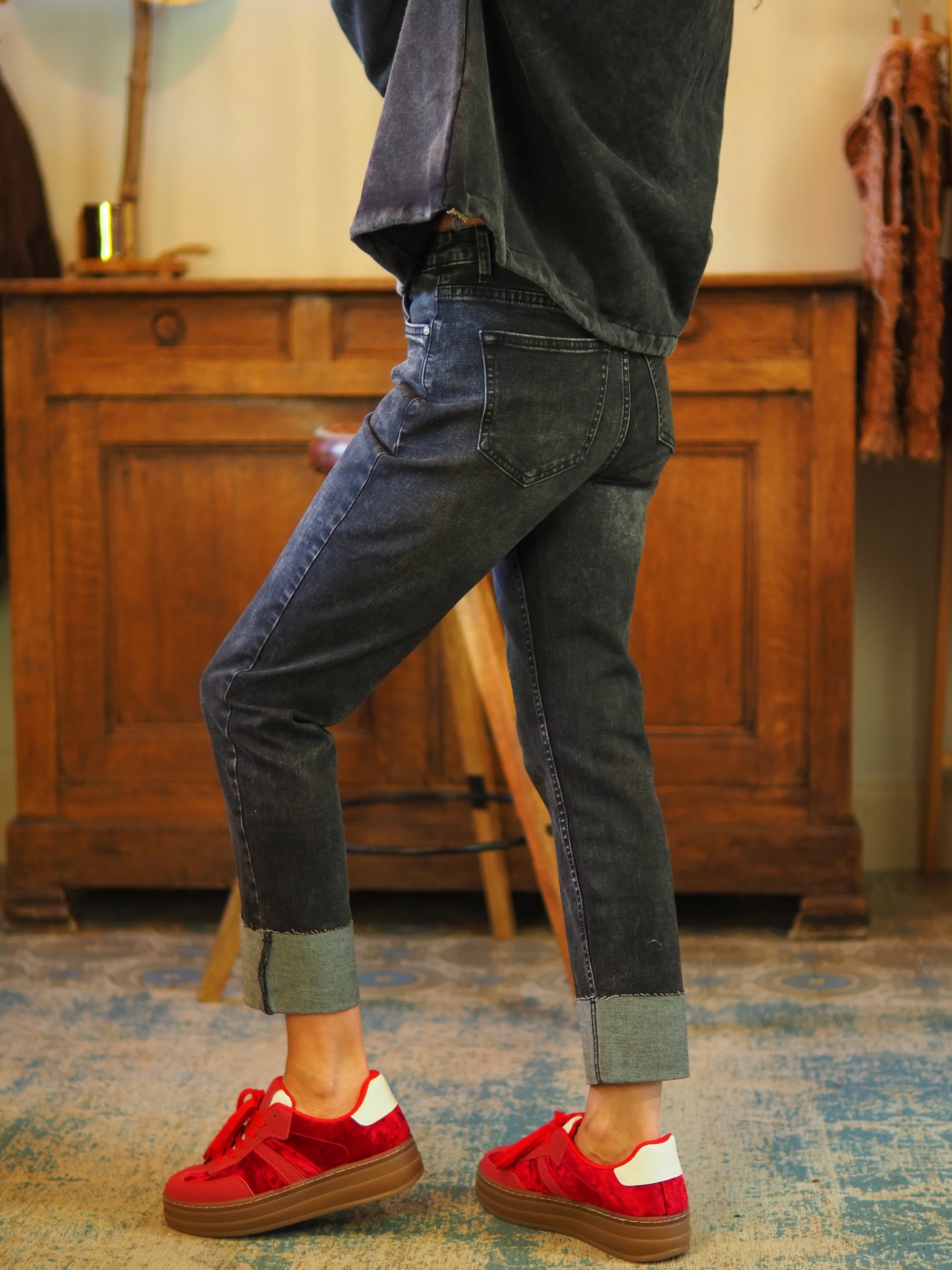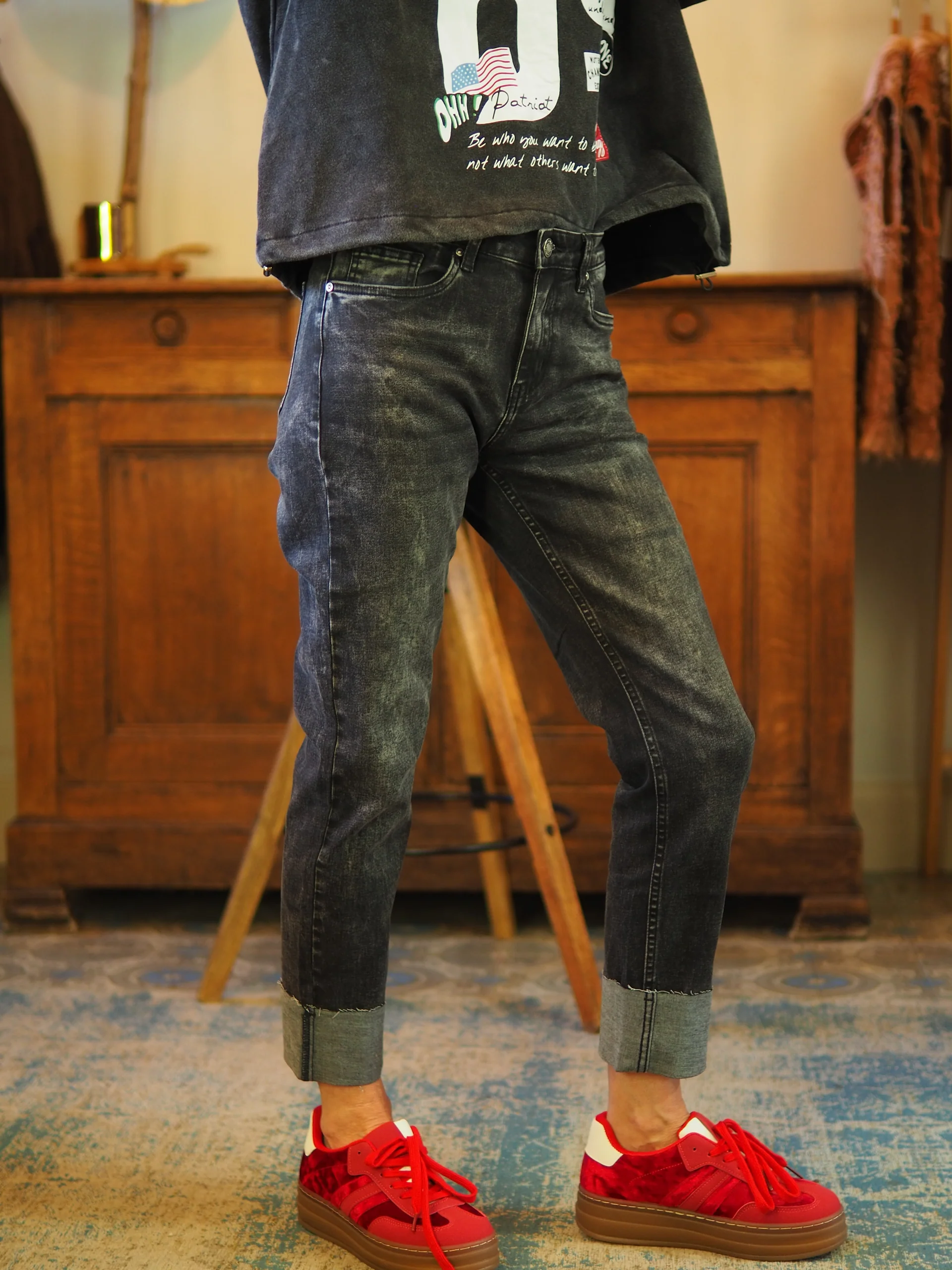 Jeans noir délavé hyper confortable. Taille bien. Taille 36, 38, 40 et 42. 72,7% Coton 25,8% Polyester 1,5% Elasthanne. Cathy mesure 1m66 fait un 36 et porte une taille 36.