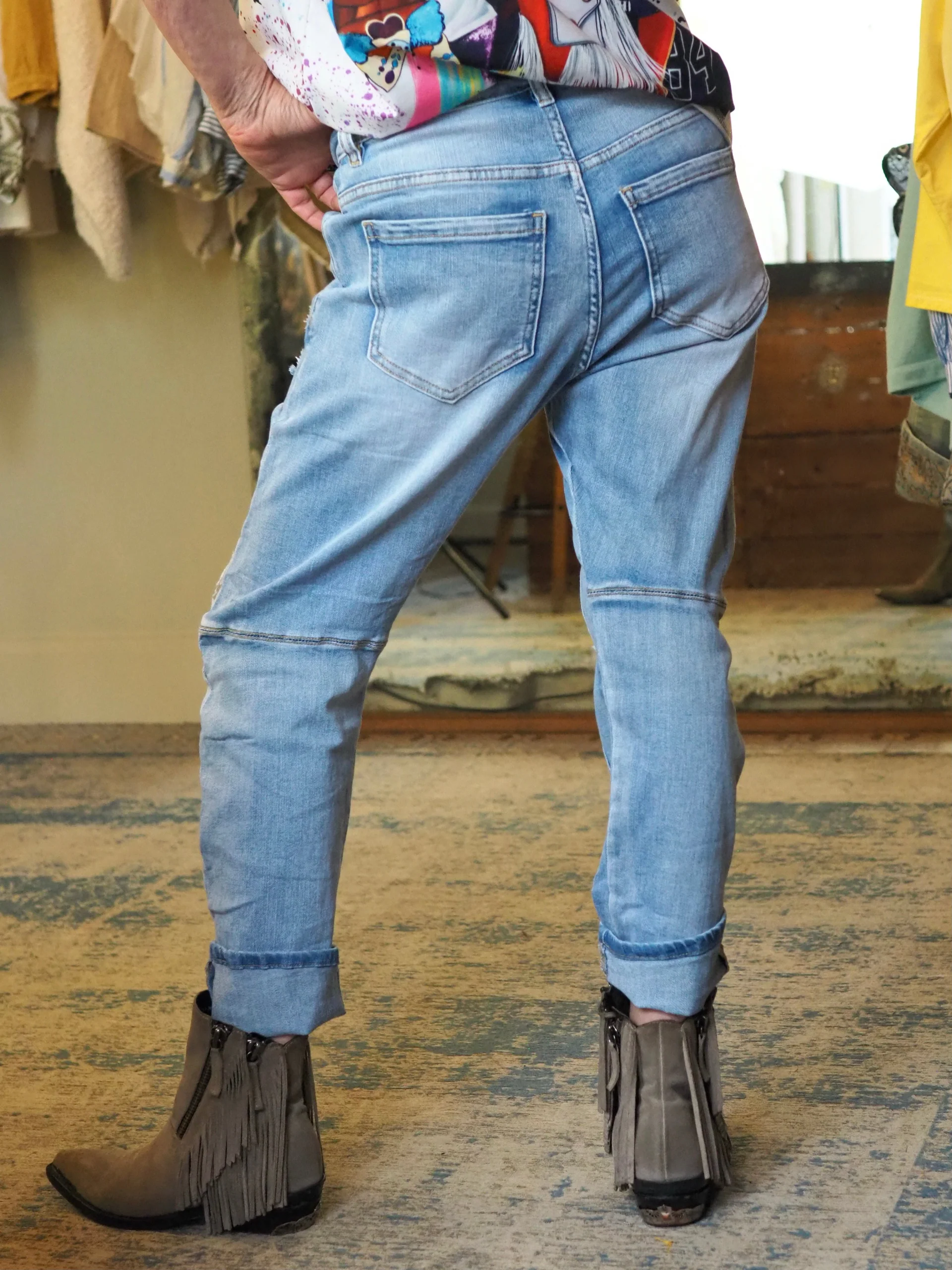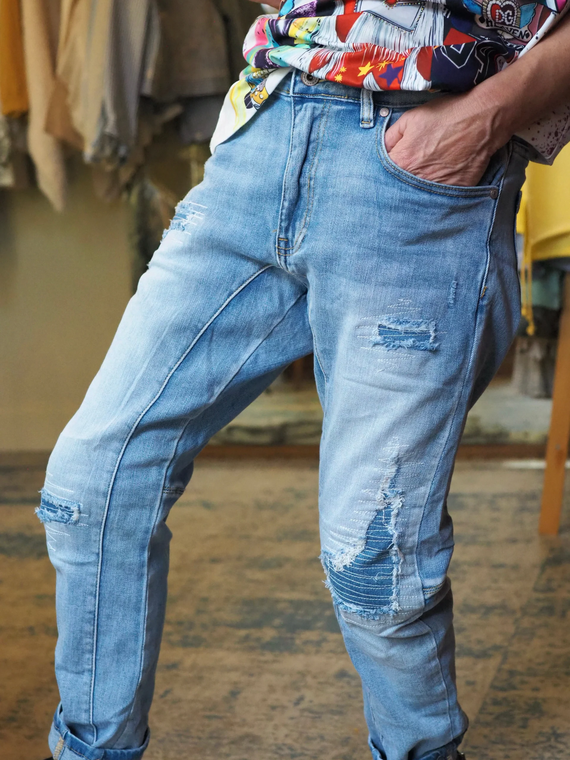 Jeans destroy. Taille bien. Très confortable. 84% Coton 15% Polyester 1% Elastane. Taille S/36 M/38 L/40 XL/42 Cathy mesure 1m66 fait un 36 et porte une taille S.