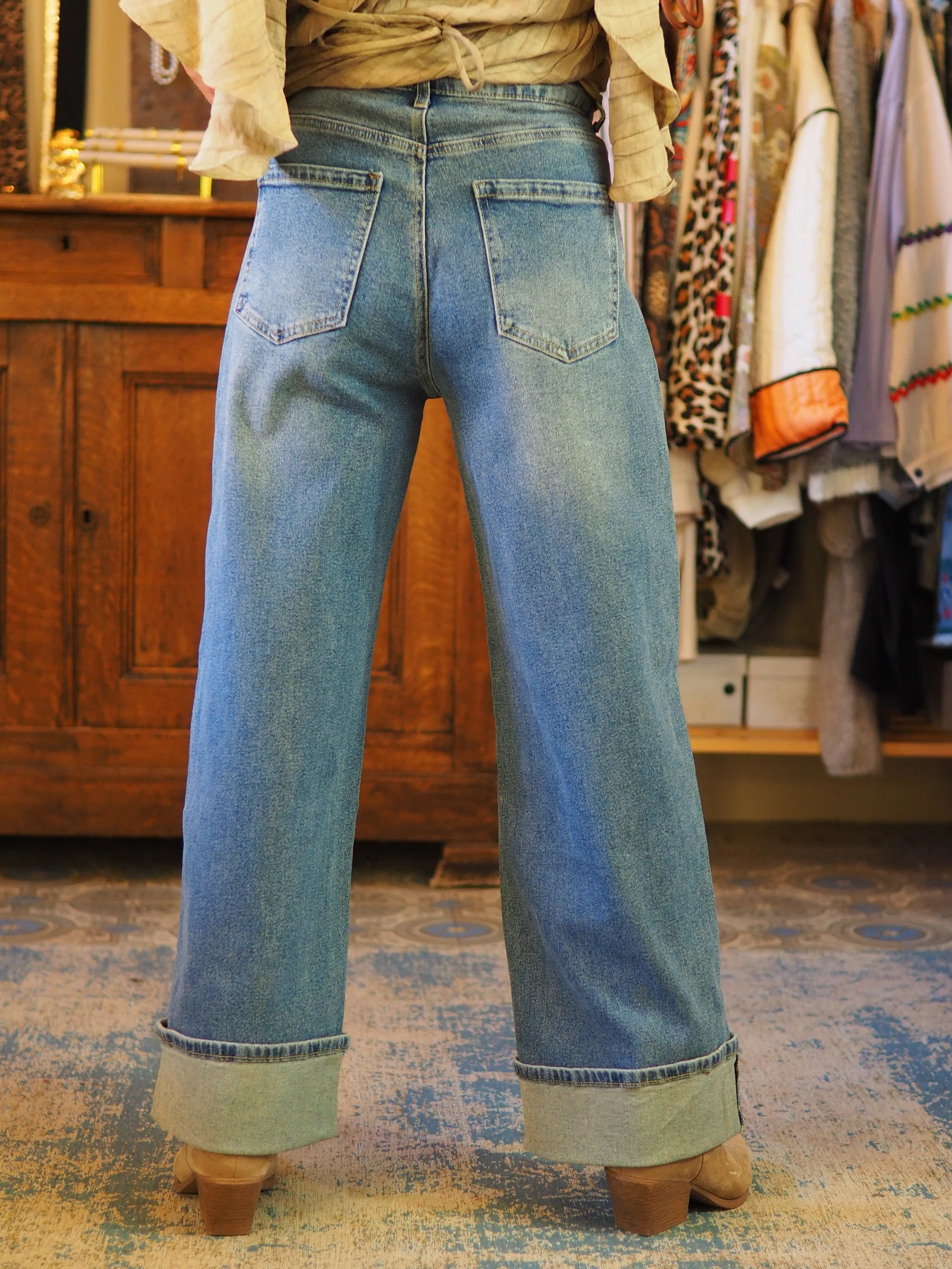 Jeans taille haute avec revers dans le bas. Peux également se porter sans les revers. Taille bien.