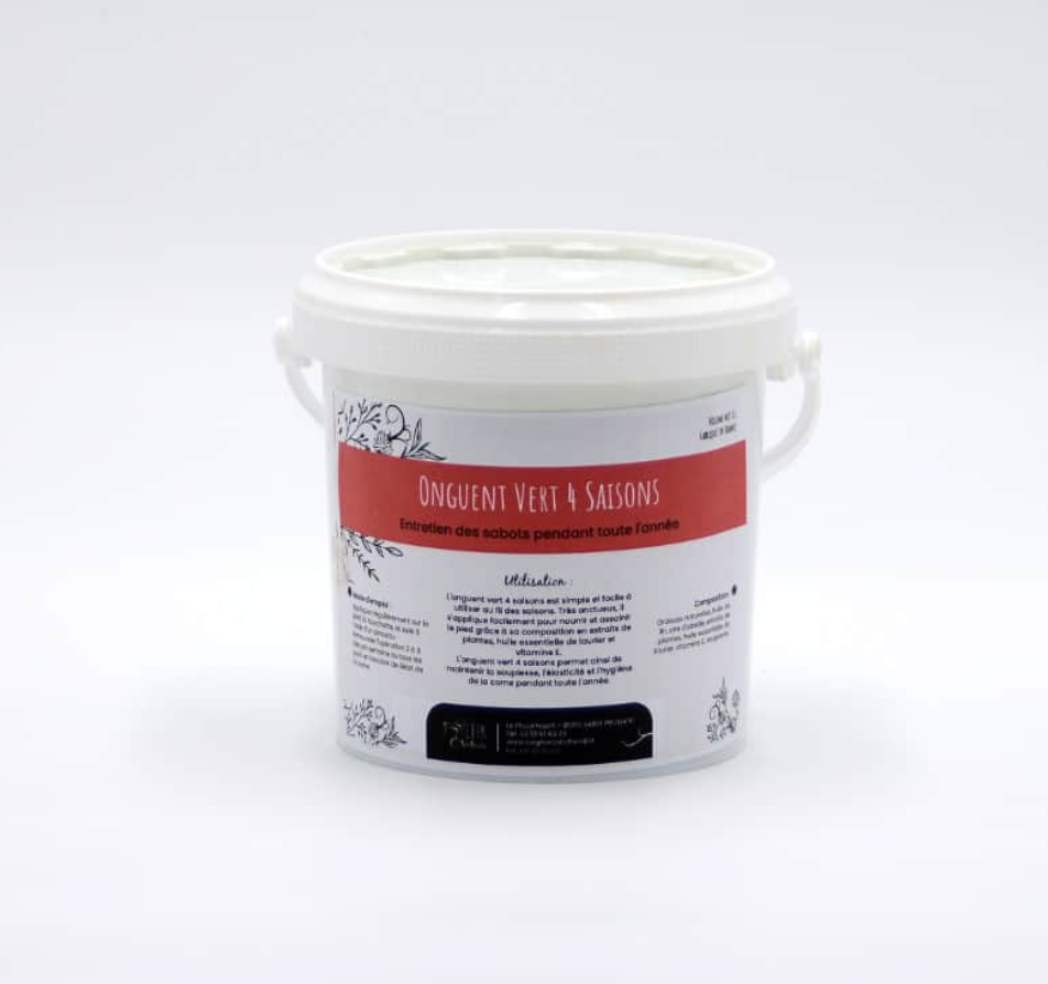 L’onguent vert 4 saisons est spécialement formulé pour être utilisé été comme hiver. Sa base de cire d’abeille, et d’huile de lin en font donc un onguent pénétrant facilement, hydratant, et très doux pour le sabot du cheval.