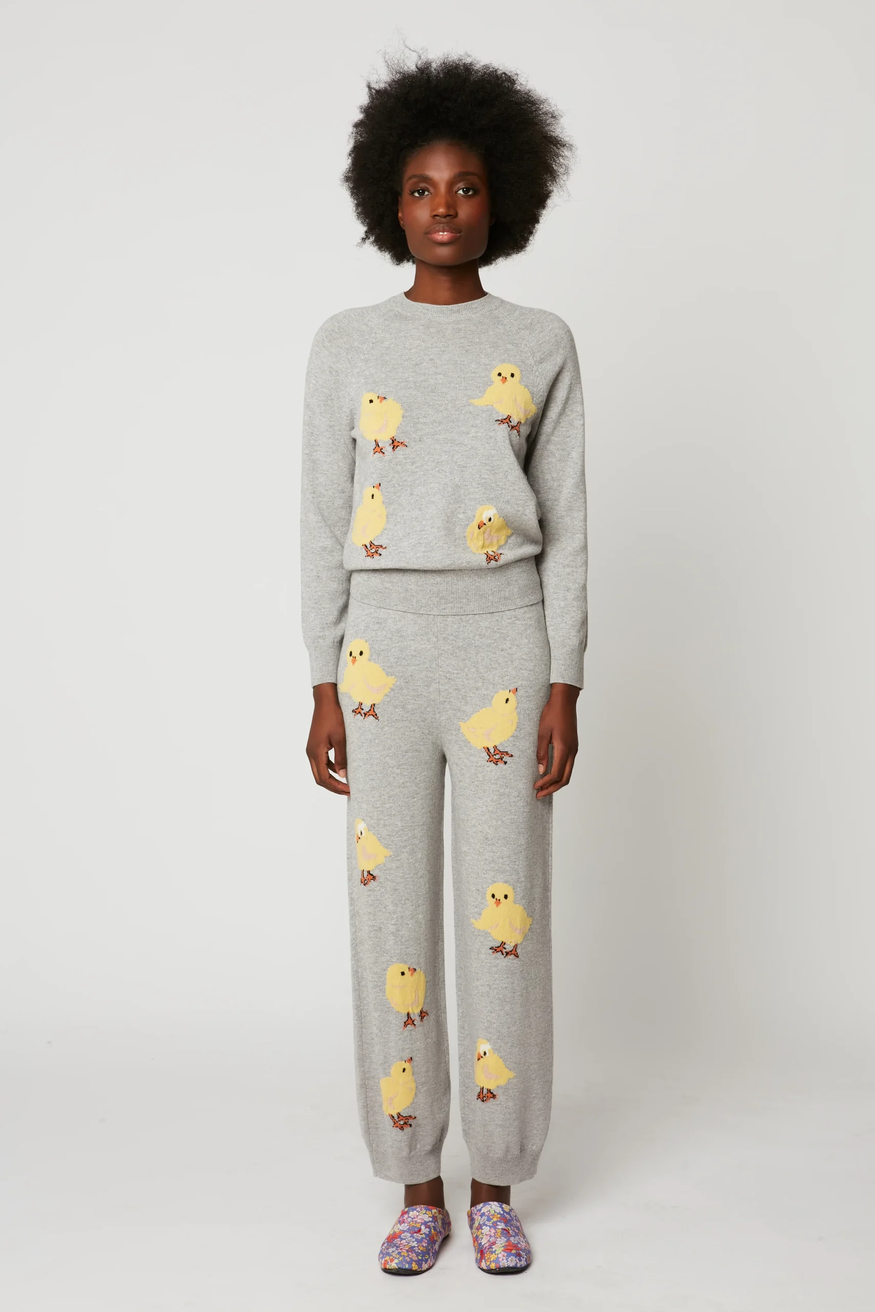 Le pull POUSSIN est un pull de pyjama fabriqué dans un tissu en laine et cachemire imprimé de poussins. Ce pull est caractérisé par une coupe droite, une encolure ronde, des emmanchures raglans ainsi que de manches longues. Le bas de pull ainsi que les poignets sont resserrés.