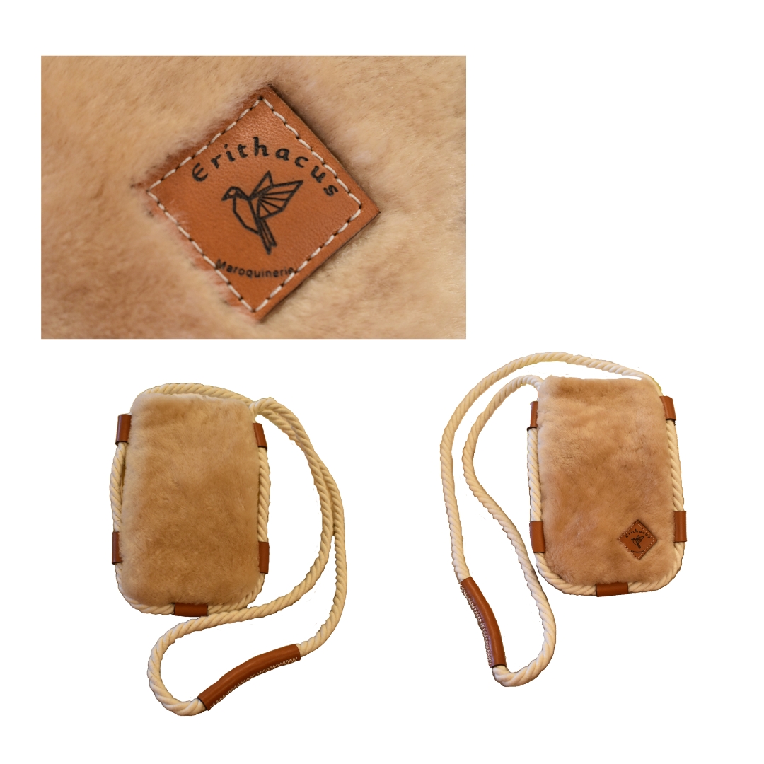 Pochette de téléphone en peau de mouton, doublée de tissu haut de gamme et équipée d’une corde en coton, fabriquée à la main avec couture machine dans notre atelier-boutique vendéen De Cuirs et de Crins.