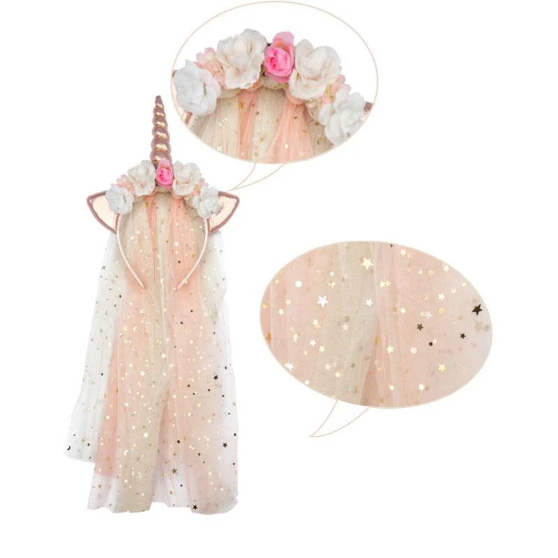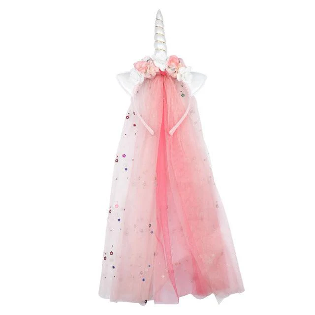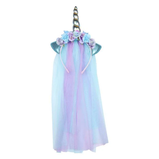 Serre-tête licorne avec traine qui vient cascader sur l’arrière de la tête.