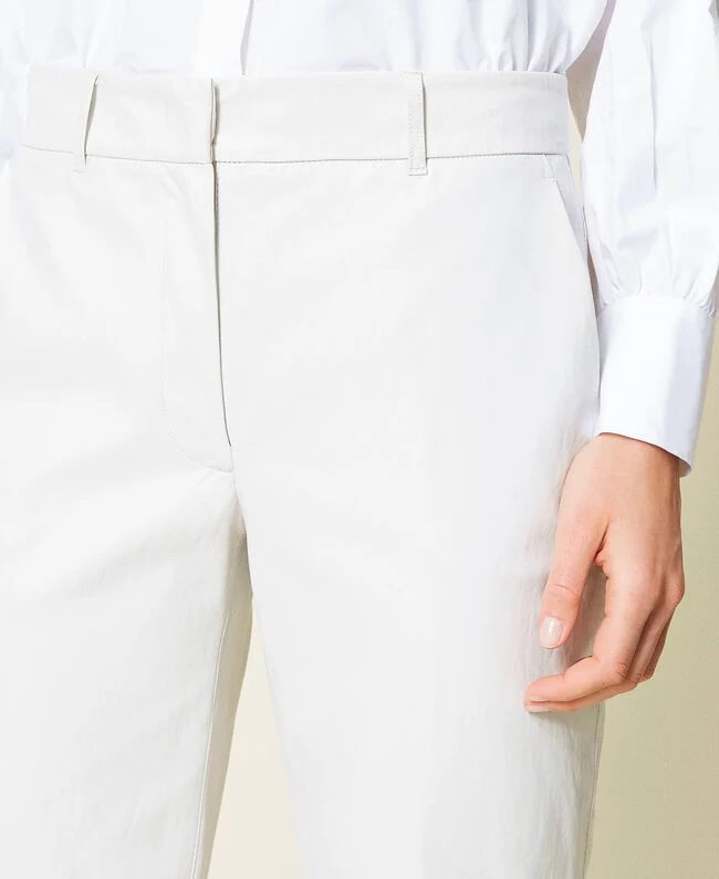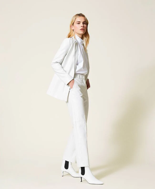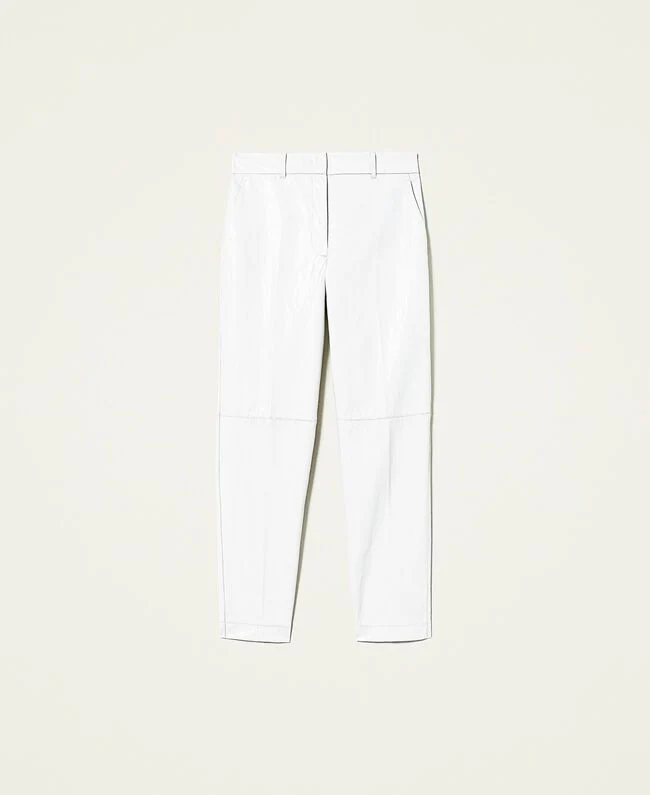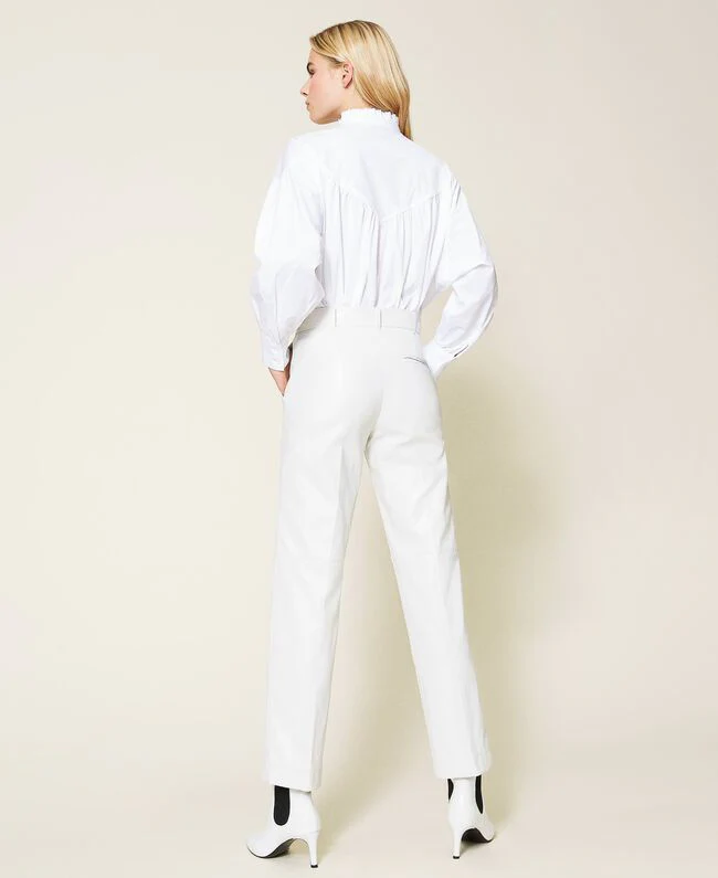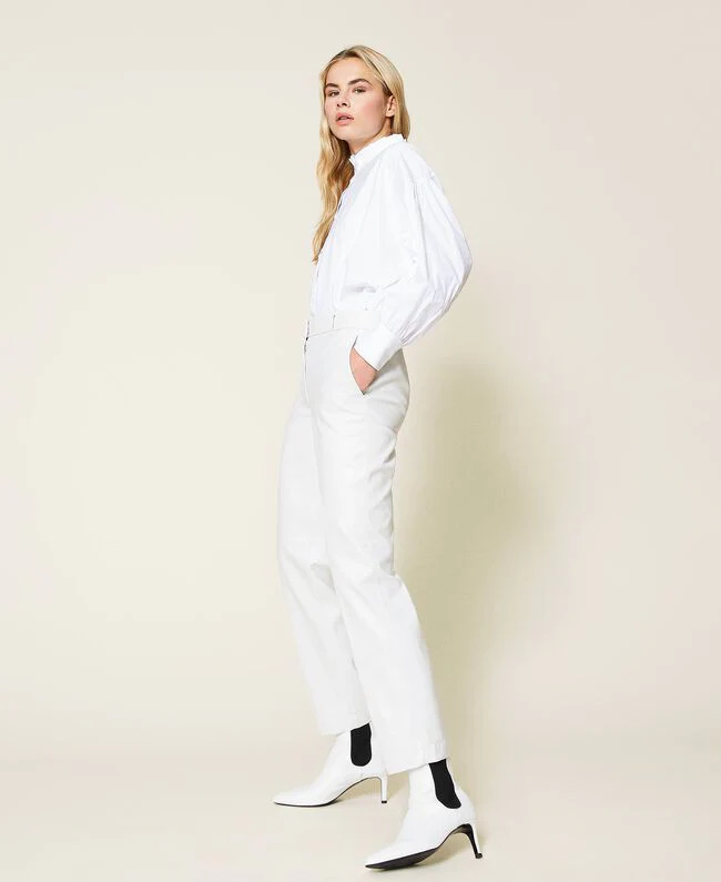 Arborez un look fort et moderne grâce au pantalon d’inspiration masculine en tissu enduit, avec coupe droite, fermeture éclair et bouton sous-patte, poches italiennes, pli marqué. Faites-en le protagoniste de jeux de textures intéressants, en l’associant à un pull doux ou une chemise fluide.