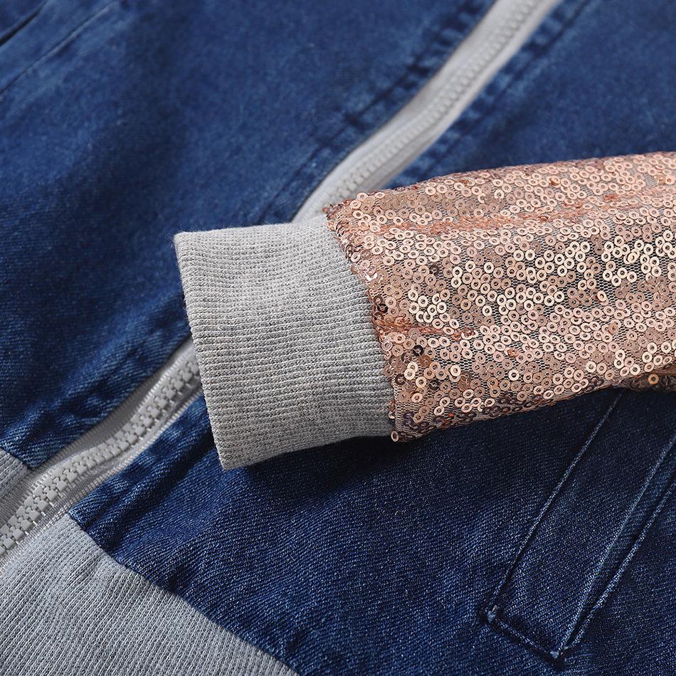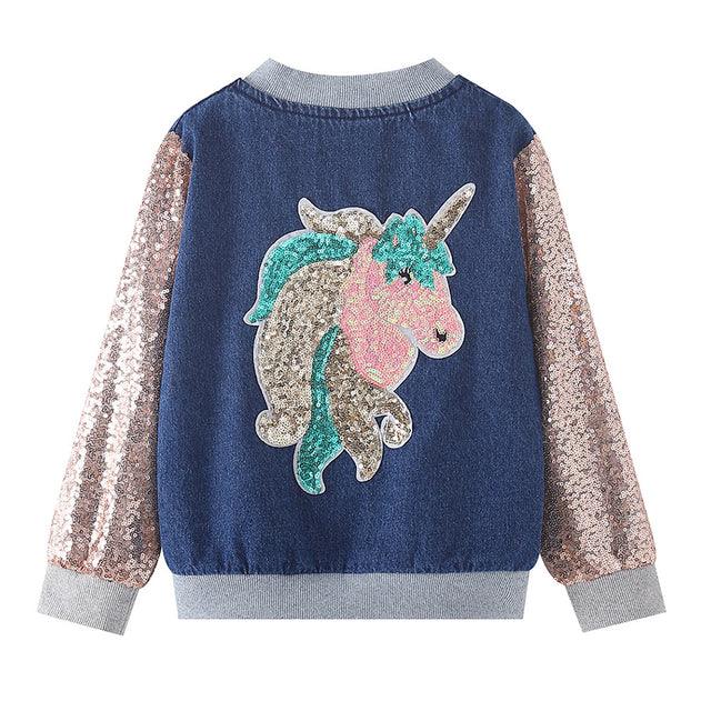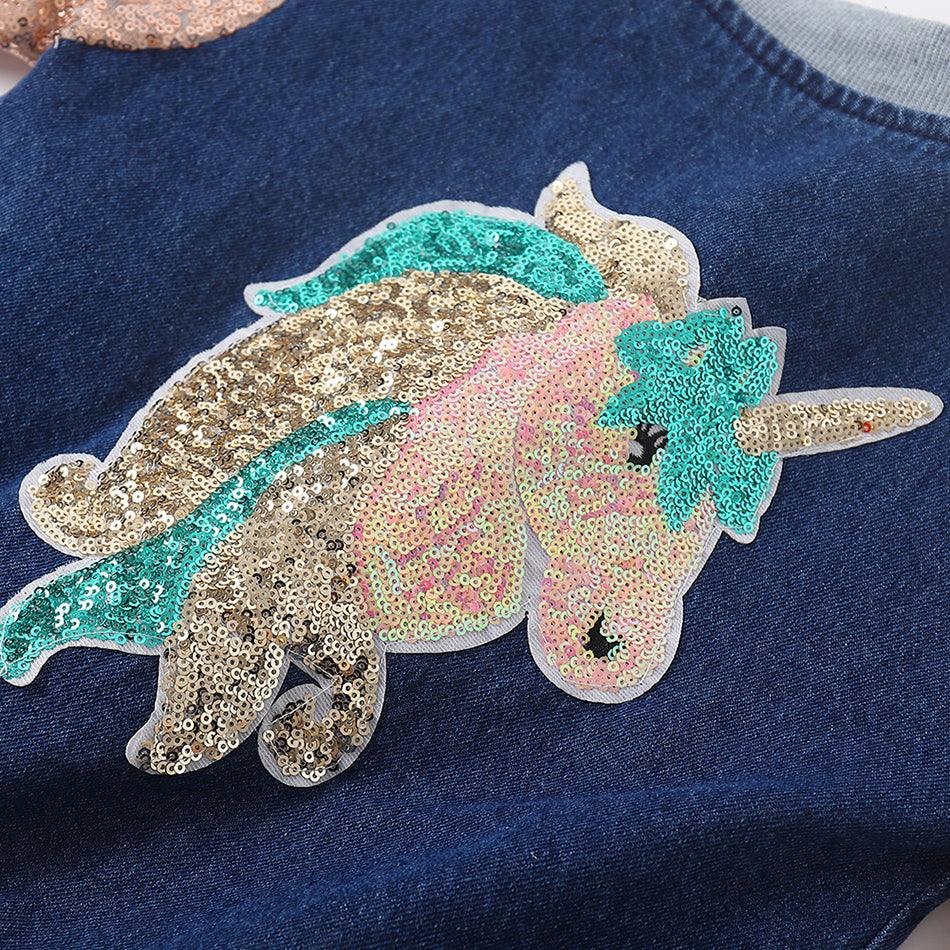 Un style unique entre la matière jean et les manches à paillettes. Le motif de tête de licorne sur le dos apporte sa touche girly et chic.