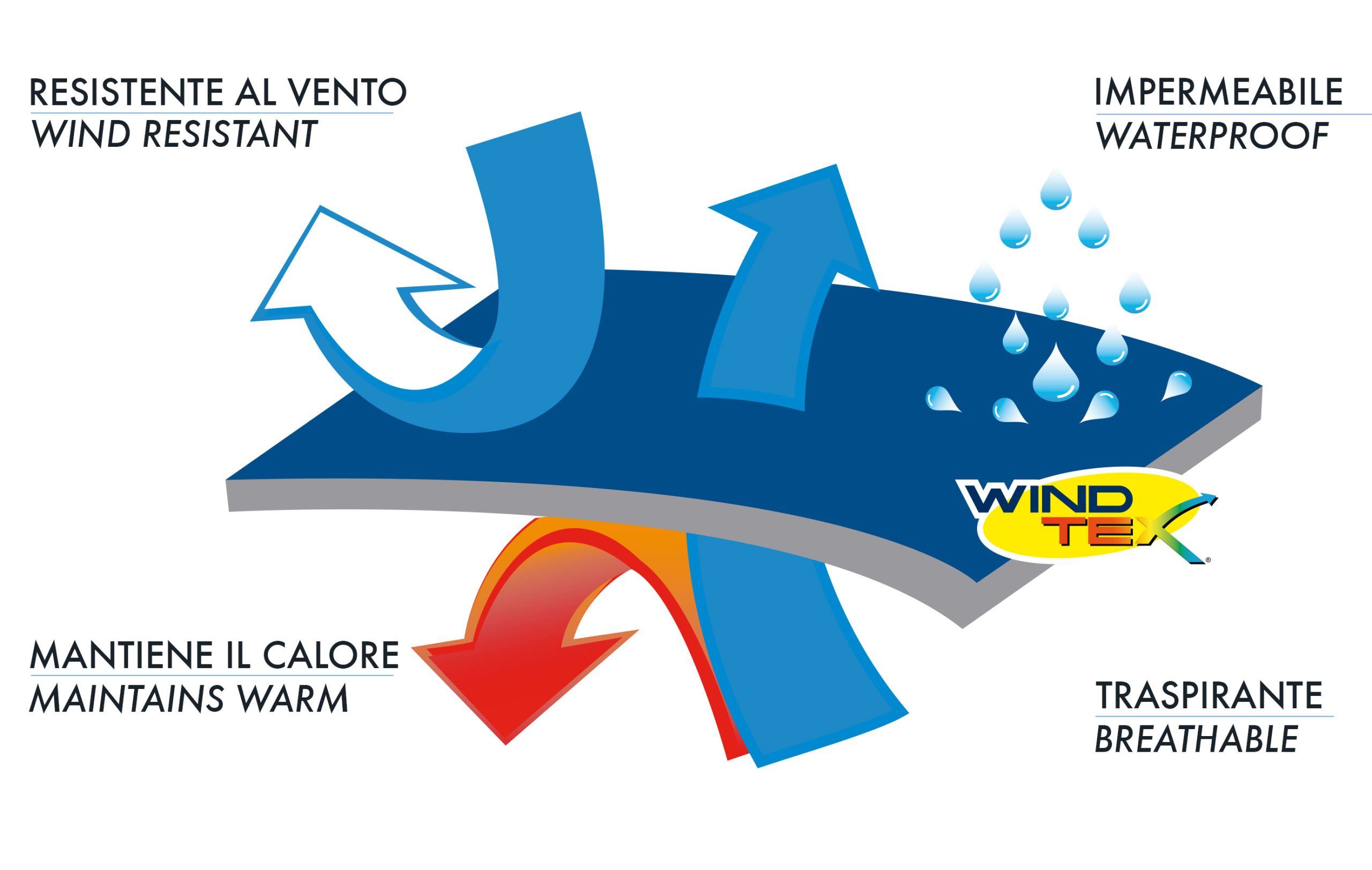 - Tissu Windtex léger et protecteur, offrant un très haut niveau de respirabilité et de protection contre le vent et la pluie.